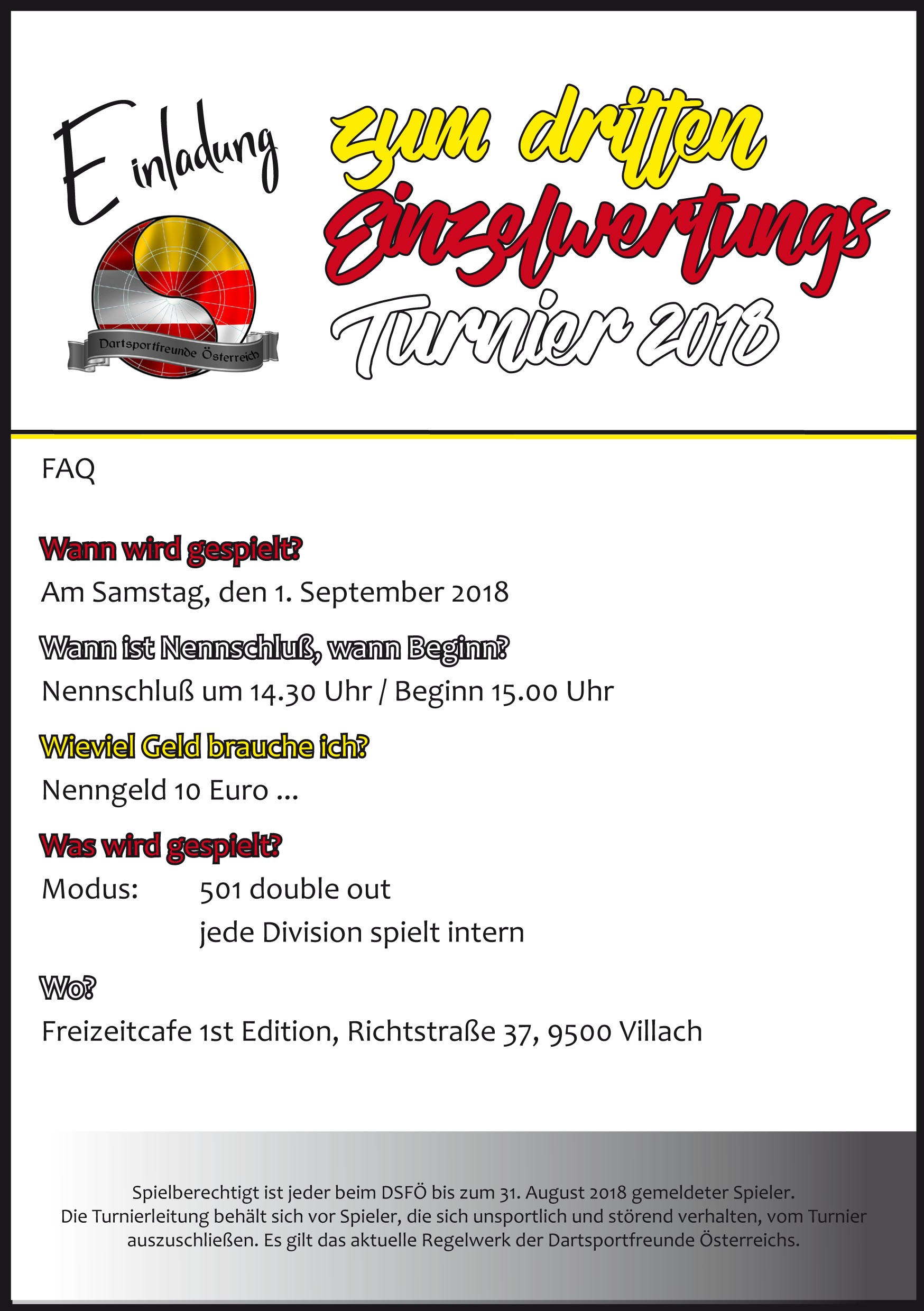 Das 9. Steeldart-Open findet am 4.11.2018 statt. Das Finale, bei dem die besten 16 Herren und die besten 8 Damen spielberechtigt sind, wird am 25.11.2018 gespielt.