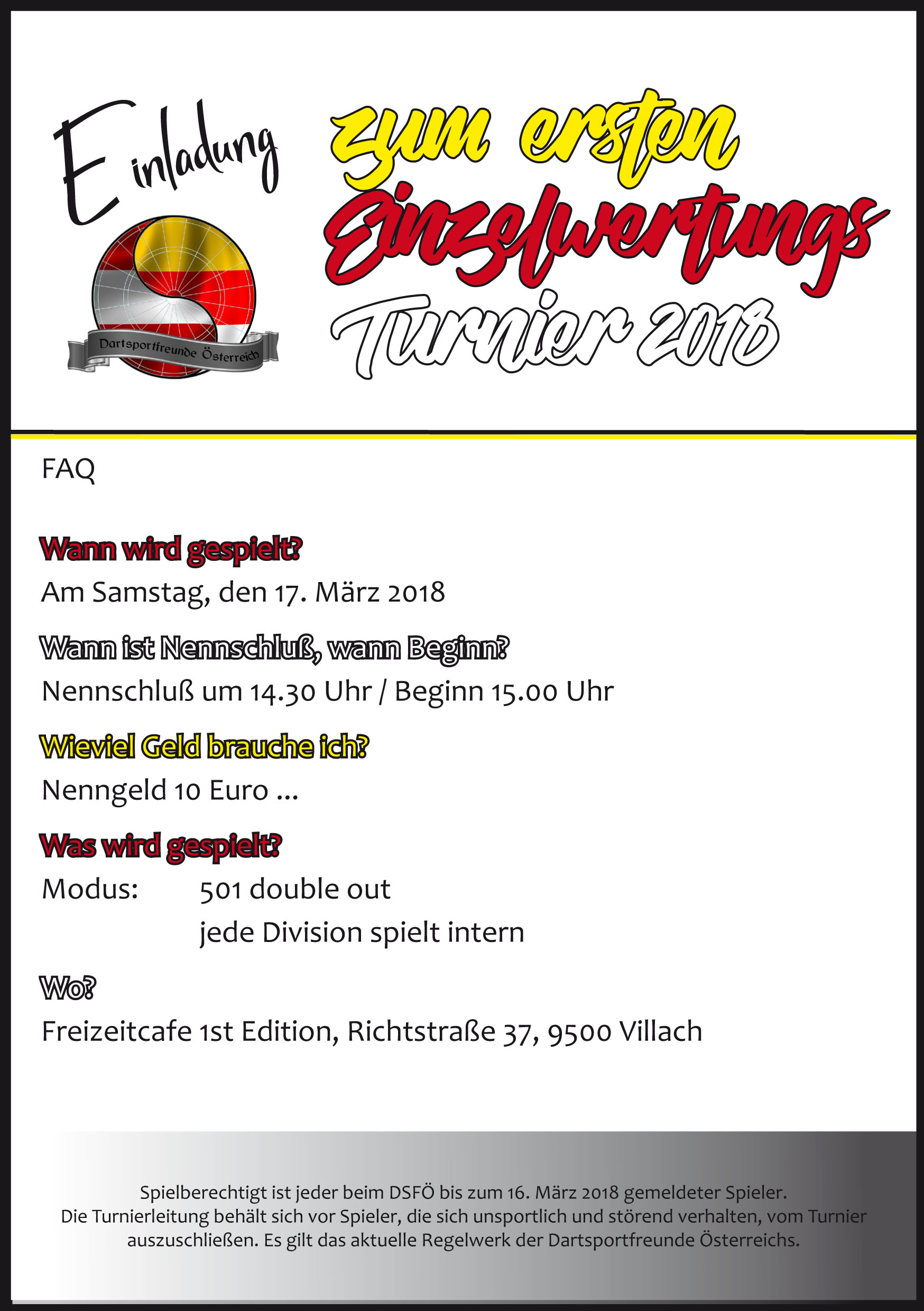 Apropos Steel Dart: Am Sonntag den 22.04 findet das 3. Turnier der DSFÖ Steeldart Open statt. Rege Teilnahme ist erwünscht. :)