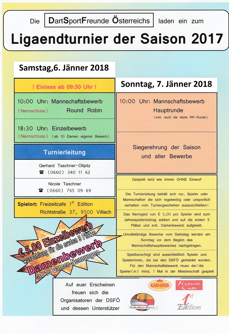 Außerdem haben wir heuer eine Steeldart Turnierserie im Programm, die für alle Spieler offen ist. Man muss also nicht in einer DSFÖ-Liga mitspielen um spielberechtigt zu sein. Das Regelwerk findet ihr im Menü unter "DSFÖ".